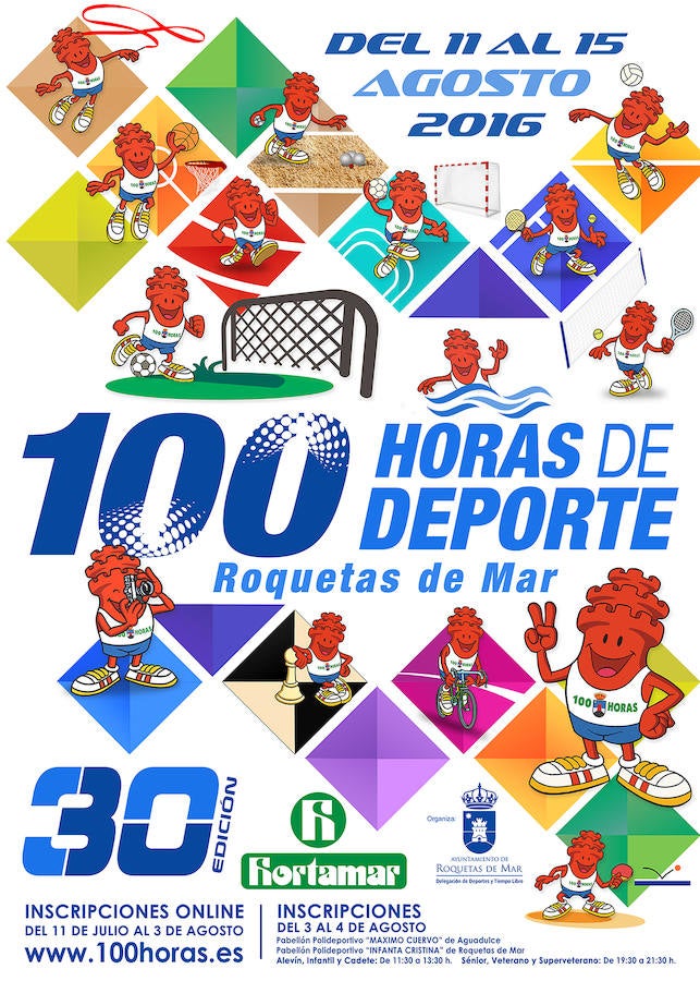 La semana que viene Las 100 horas del Deporte se presentarán en un acto oficial. Esta edición se celebrará del 11 al 15 de agosto y presenta una serie de novedades que se comunicarán próximamente. Por ahora ya se conoce el cartel, protagonizado por la mascota Roque que aparece ataviada con la indumentaria necesaria para practicar cada uno de los deportes que se pueden disputar en Las 100 horas.