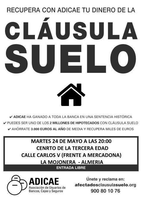 ADICAE, en colaboración con el Ayuntamiento de La Mojonera, organiza para este martes a partir de las 20 horas, un Taller sobre Cláusulas Suelo, abierto ... a todos los interesados.
