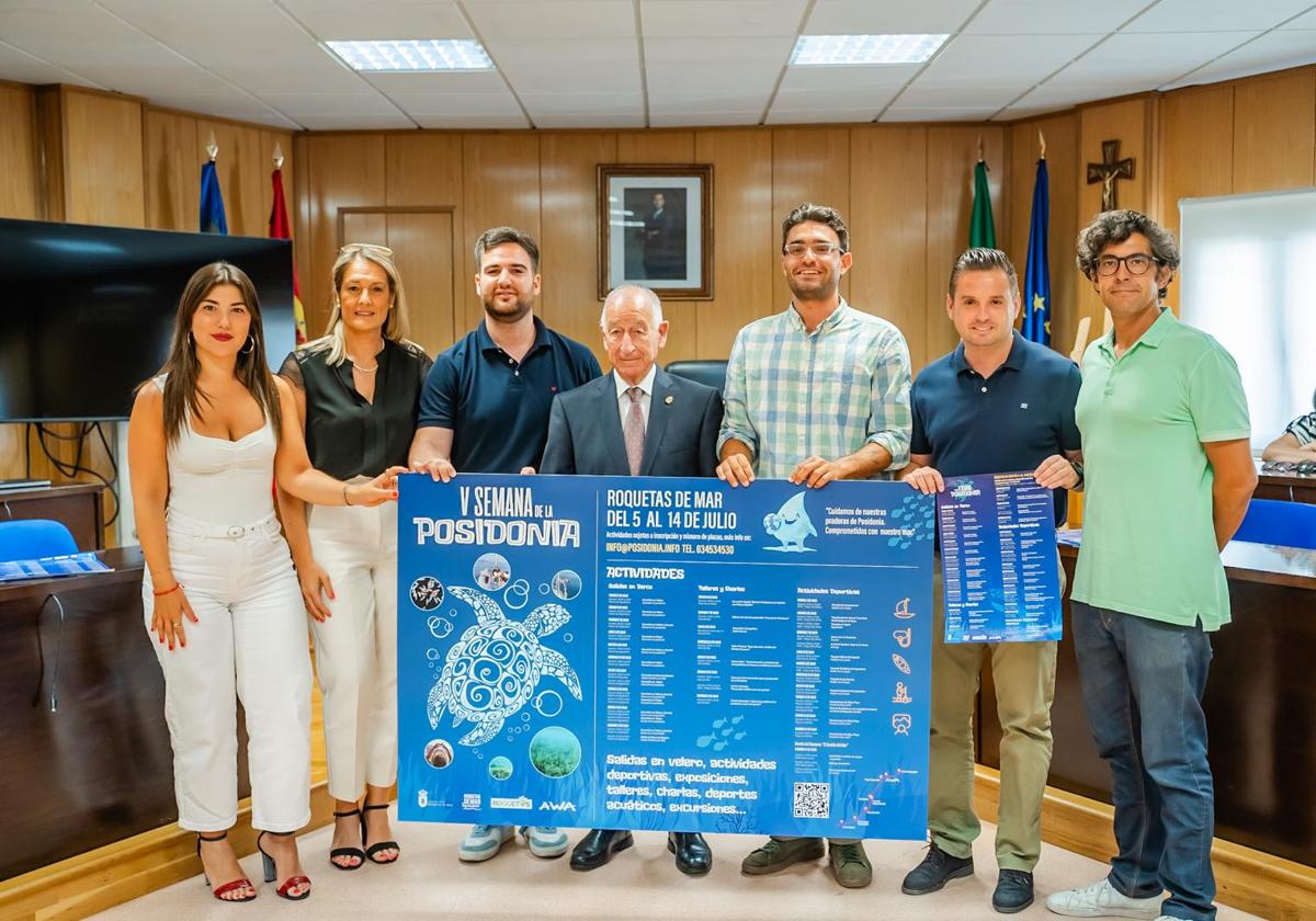 El alcalde de Roquetas de Mar, Gabriel Amat, junto con el concejal de Medio Ambiente, Juan Carlos Muyor, Alejandro Martín, director del Proyecto Posidonia y Juan Raúl Sánchez, gerente de la empresa Awa Watersport presentaron la programación de actividades que abarcan más de 30 actividades con las que se pretende divulgar y concienciar sobre los valores medioambientales de los campos de posidonia, auténticos jardines submarinos.