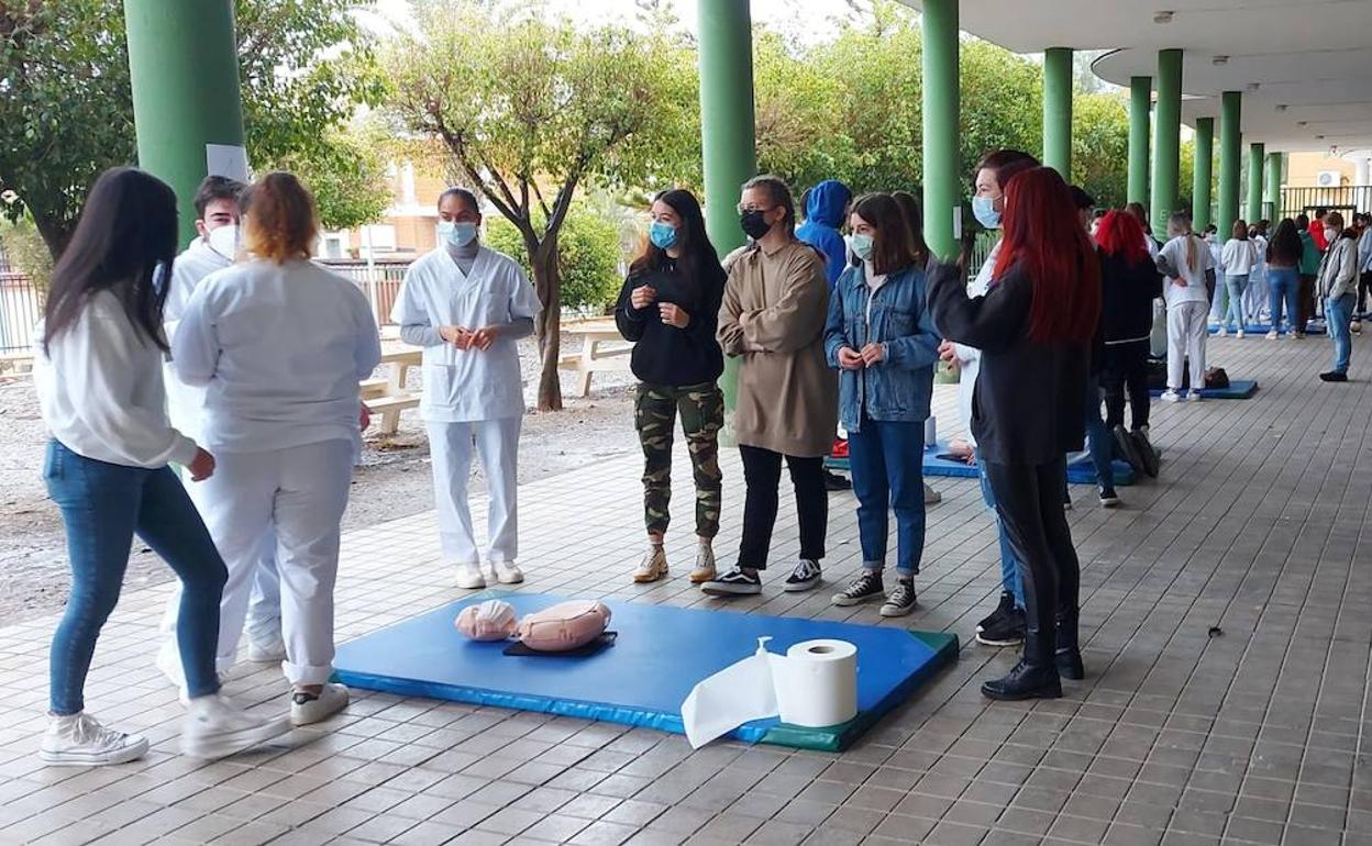 Las jornadas de salud y medio ambiente del IES Aguadulce se iniciaron este pasado miércoles y se prolongarán hasta este viernes con múltiples actividades. La más destacada es la enseñanza de técnicas de primeros auxilios para buena parte del alumnado del centro, con talleres que se están impartiendo durante estos días. También se están llevando a cabo charlas con expertos que están tratando cuestiones como la nutrición en los adolescentes, la prevención de caídas de personas mayores o la importancia de la donación de sangre. Además, se ha hecho una campaña de donación de sangre entre el alumnado y el profesorado.