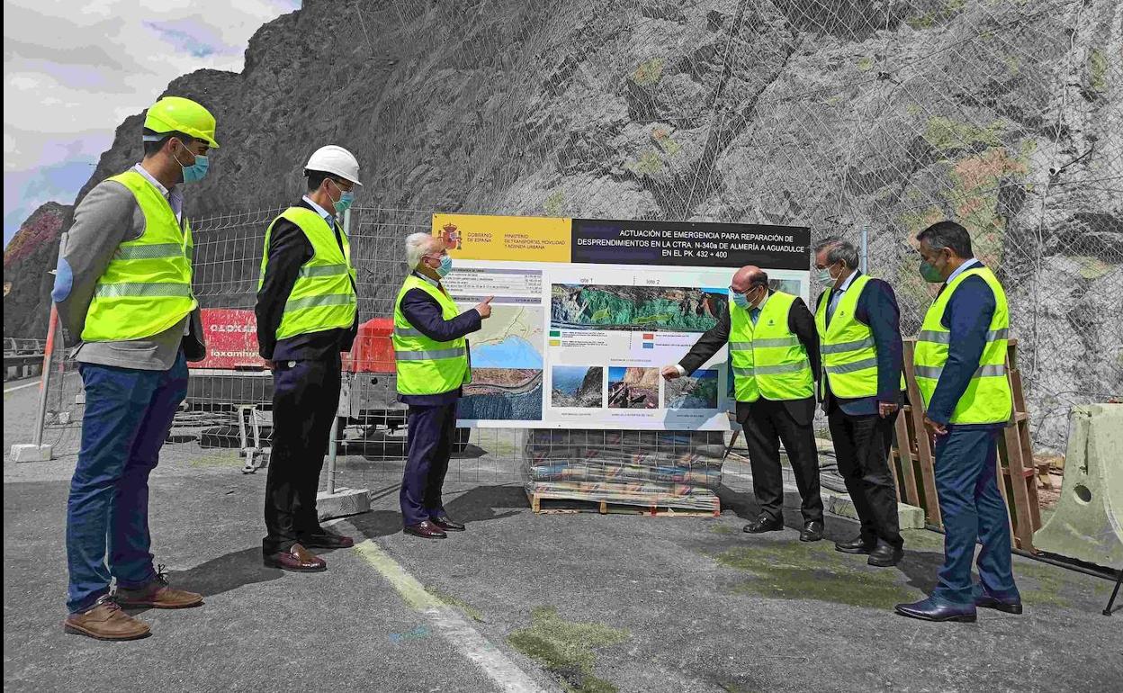 El subdelegado, Manuel de la Fuente, visitó hoy la zona afectada junto a responsables de Carreteras, entre otras autoridades, para informar del avance de las obras que se están llevando a cabo sobre 180 metros de talud y que se encuentran en estos momentos en la quinta y última fase. Para ello se están realizando labores de pretensado, con la colocación de más 2.000 tuercas, y configurando las mallas de triple torsión, bulones y pantallas dinámicas, con las que se quiere proteger la carretera de nuevos desprendimientos.