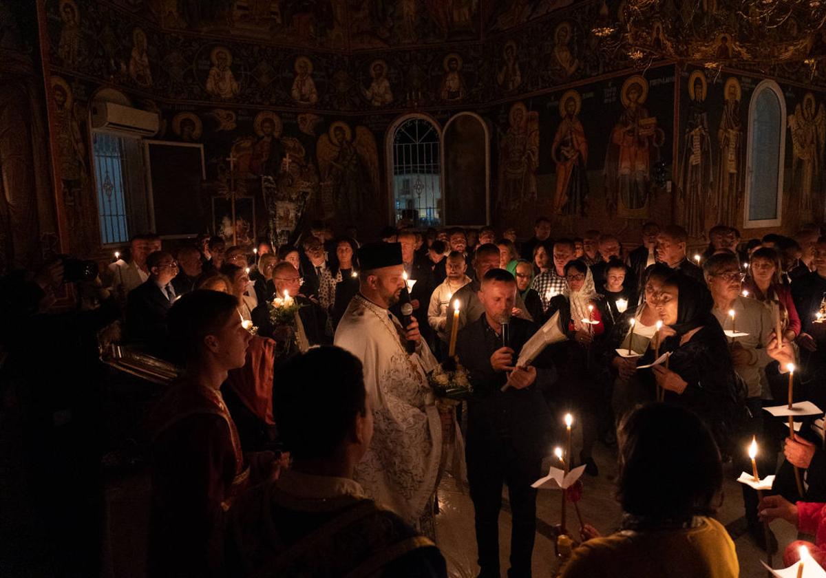 La tradición ortodoxa rumana dice que la liturgia comience con el templo a oscuras a las 12 de la noche del sábado, pero para coincidir con la hora de Rumanía, en Roquetas se adelanta una hora el anuncio de que Cristo ha resucitado y un cirio encendido que porta el sacerdote así lo simboliza.