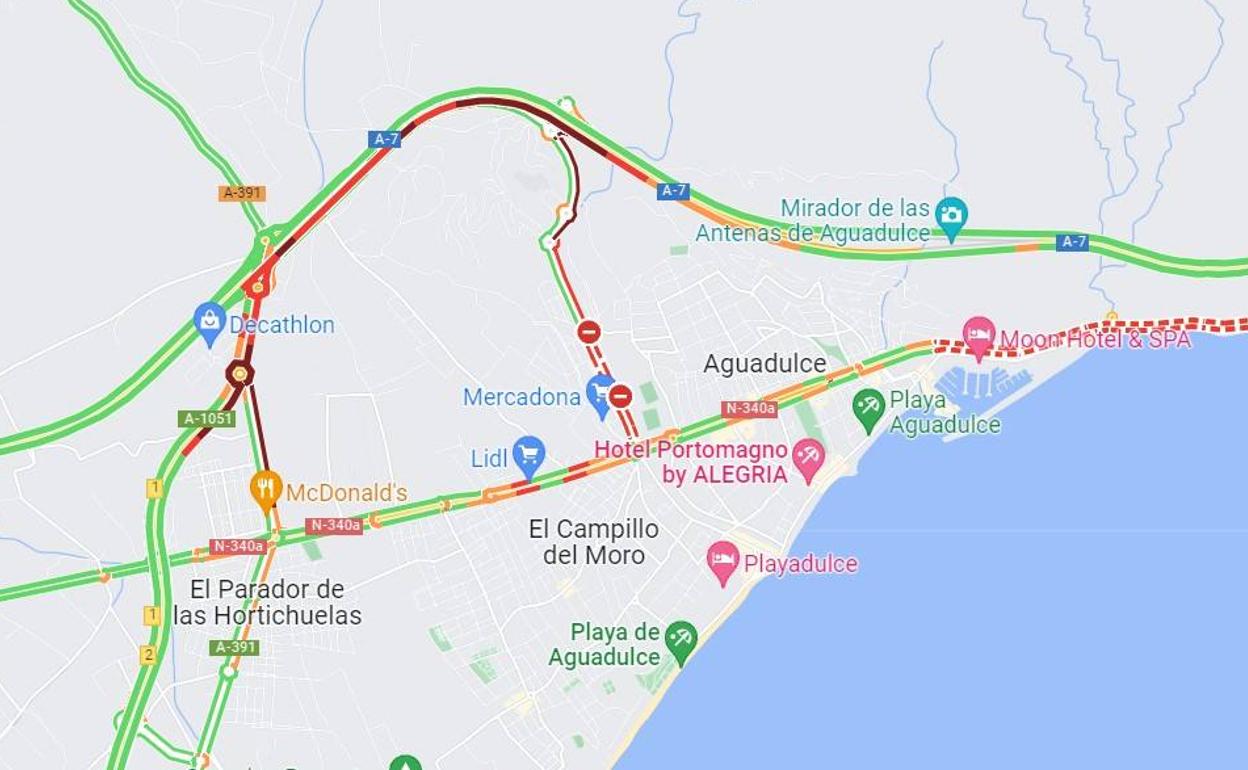 Unas retenciones que, como consecuencia del tráfico, también afectan al tramo final de la Variante de Roquetas, la rotonda en la que desemboca esta vía y el tramo que comunica esta rotonda con la A7.