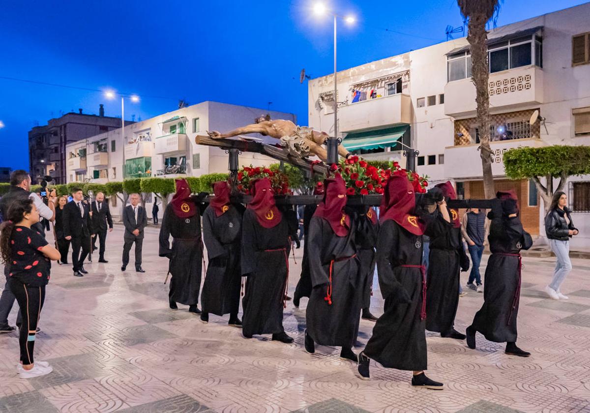 La Hermandad del Cristo de la Expiración de Roquetas de Mar celebró este Martes Santo su salida procesional, caracterizada por un impresionante silencio a lo largo de todo el recorrido, solo roto por los tambores.