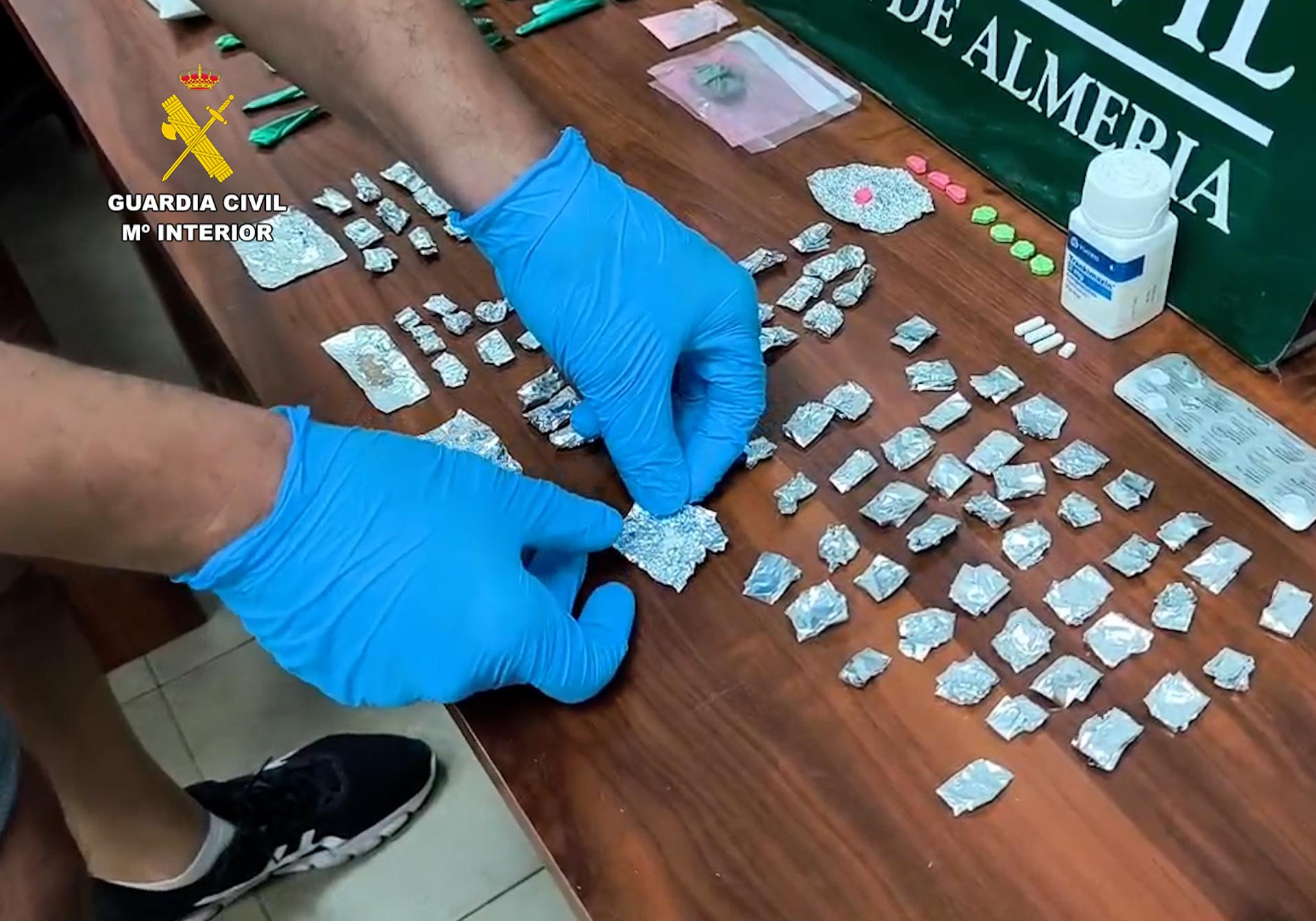 Ante la solidez de los indicios recabados, el pasado 30 de mayo la Guardia Civil procedió a la entrada y registro de la vivienda con la colaboración de las Patrullas Rural de Compañía de El Ejido (P.R.C.) donde se incautaron 209 gramos de metanfetamina en polvo; 206 gramos de metanfetamina en roca; 20,9 gramos de cocaína en roca; 5,6 gramos de 'tutsi' o cocaína rosa; 1,7 gramos de heroína; 7 comprimidos de metanfetamina; 10 comprimidos de Rivotril o 3,5 comprimidos de Trankimazin y 529,59 euros en efectivo.