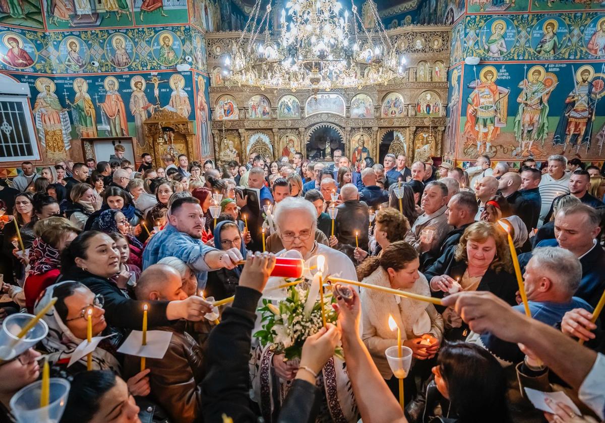 La tradición ortodoxa rumana dice que la liturgia comience con el templo a oscuras a las 12 de la noche del sábado, pero para coincidir con la hora de Rumanía, en Roquetas se adelanta una hora el anuncio de que Cristo ha resucitado y un cirio encendido que porta el sacerdote así lo simboliza.