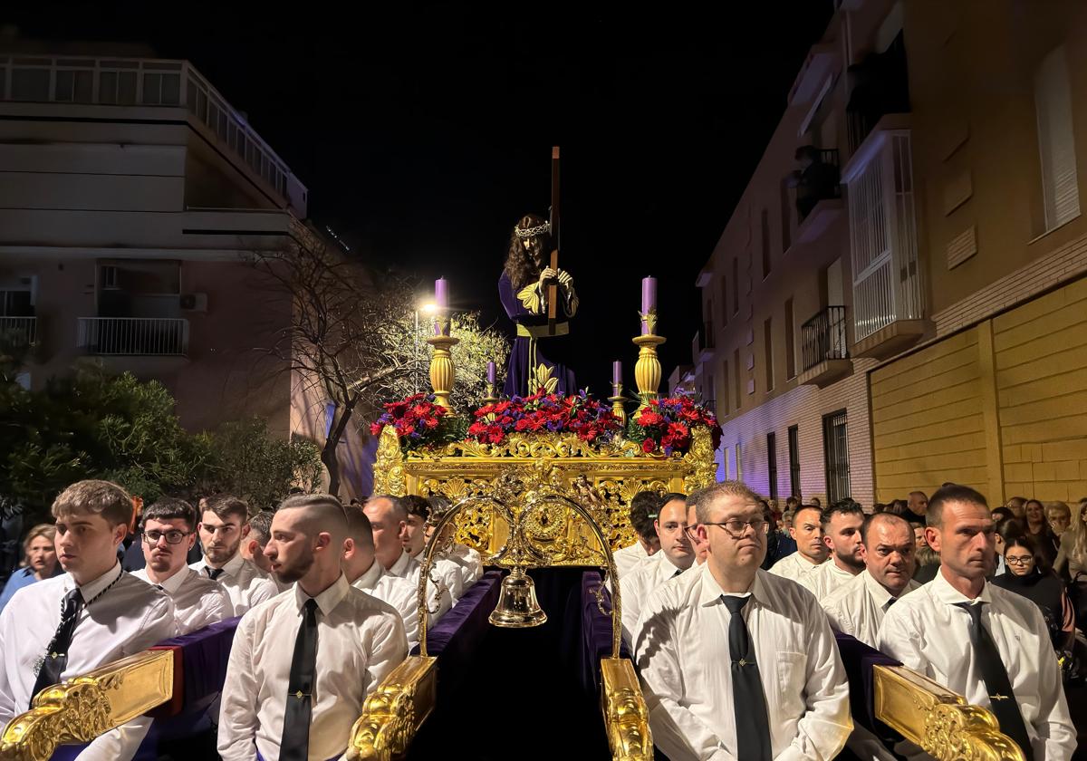 Este paso, en el que se ve a Jesucristo cargando la cruz, postrándose alicaído y llevando puesta una prenda morada, con una corona de espinas, en el que se le cerciora de forma notoria lágrimas con un color granate emulando a la sangre y el sudor que pasó en su recorrido hasta la cruz. Un paso que recorrió distintas calles del municipio costero.