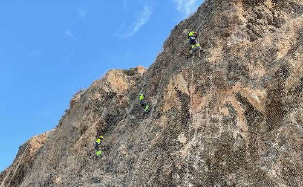 De esta forma, los operarios están ya procediendo al saneo de fragmentos de roca inestables, así como la colocación de una malla de guiado. Igualmente, se está instalando una red de cables anclada al terreno mediante bulones o anclajes, además de barreras dinámicas.
