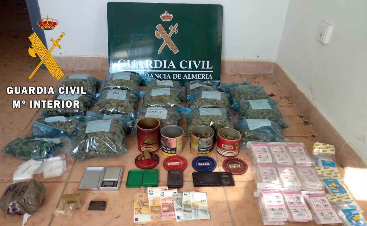 Tras inspeccionar y proceder al correspondiente registro, se intervino la cantidad de 178 plantas, útiles para el pesaje, envoltorio y venta de las dosis de droga, 235 gr de hachís, más de 3,305 kg de cogollos envasados, además de dinero en metálico para el cambio de las transacciones.