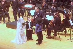 El concierto ha comenzado con la Danza Húngara de J. Brahms. Luego llegaría la banda sonora de Superman de J. Williams con la participación de un chico que salió vestido de este héroe al escenario. La banda sonora de la Pantera Rosa de H. Mancini dio paso a la Marcha Nupcial de Mendelssonh. Esta pieza hizo que salieran al escenario el cura y la pareja de novios, de muy corta edad, que sellaron su amor ante el público e incluso se besaron.