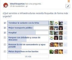 Pasados unos días, ya tenemos los primeros resultados de la encuesta que IDEAL ha puesto en marcha en Facebook para conocer las prioridades de los roqueteros en materia de infraestructuras y servicios. La encuesta se ha publicado días antes de la presentación de los presupuestos municipales para 2013, que este viernes se han facilitado a los grupos de la oposición con la idea de que sean aprobados la próxima semana. La consulta, que ha tenido en solo cuatro días 1.300 visitas, ha implicado la votación de decenas de ciudadanos para los que las prioridades parecen claras: variante, hospital y transporte público.