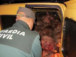 En ese momento, los agentes identificaron a los dos ocupantes del coche, observando como "ambos tenían las manos y las ropas ensangrentadas, así como el calzado manchado de excremento de animal, desprendiendo un fuerte olor a porcino". Así, como resultado del registro del interior del vehículo, la Guardia Civil descubrió diez cadáveres de cerdos en la zona de carga, animales recientemente sacrificados, al parecer por fuertes golpes con algún objeto contundente en la base del cráneo. Junto a estos se econtraron dos martillos también manchados de sangre y suciedad.