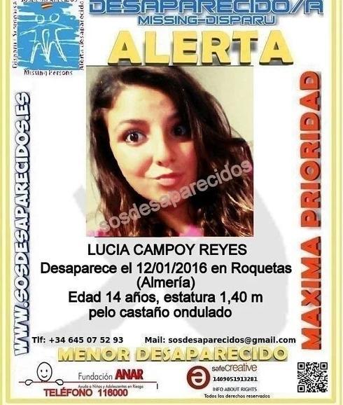 La Guardia Civil ha activado una búsqueda para localizar a una menor desaparecida en Roquetas desde este martes. Se trata de Lucía Campoy Reyes, de 14 años, que mide 1,40 metros de estatura y tiene el pelo castaño y ondulado.