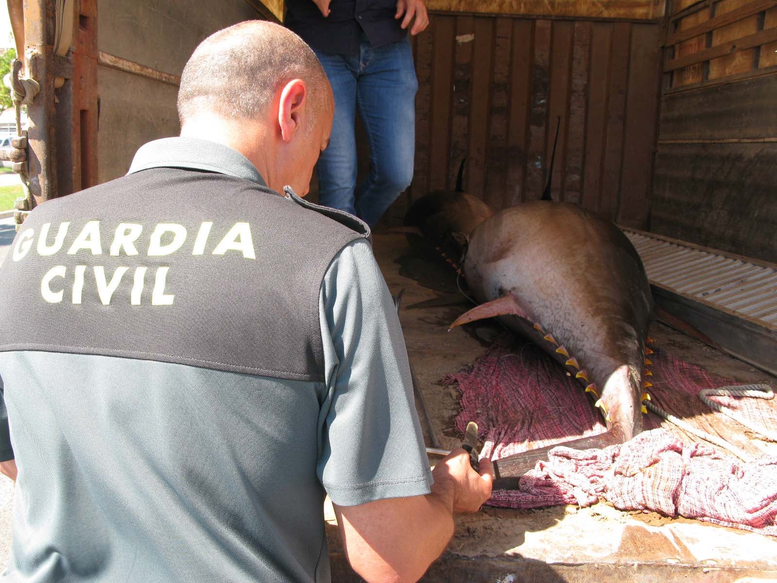 La Guardia Civil ha intervenido dos ejemplares de atún rojo --'Thunnus thynnus'-- de más de 200 kilos de peso cada uno y dos metros de ... longitud que fueron capturados de manera ilegal al haber excedido el cupo y que carecían del preceptivo precinto con los que se identifican, de forma que han tenido que ser destruidos puesto que, según el juicio clínico veterinario, tampoco eran aptos para su consumo.