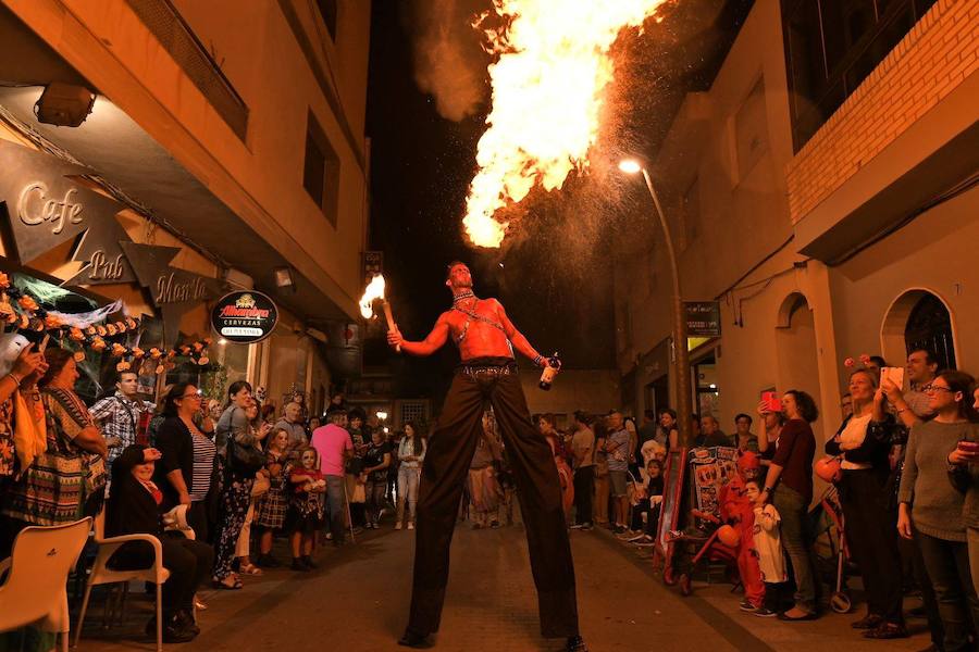 Uno de los atractivos de la fiesta, que comenzó pasadas las siete de la tarde con las primeras actividades junto al Ayuntamiento de Roquetas, fue el pasacalles, que desde las ocho recorrió las principales calles del centro, atravesando también el Paseo de los Baños y la Avenida Juan Carlos I, antes de regresar al casco histórico nuevamente. Además de acrobacias aéreas, la comitiva contó con la intervención de los grupos de baile habituales en estos recorridos, es decir, Sol de Almería, Kalesi y el Grupo de Zumba de Rocío Moreno, así como la Asociación Cultural Burbujas. Hubo zancudos, escupefuegos y todo tipo de personajes siniestros que hicieron las delicias de un público que en gran parte también acudió disfrazado a las celebraciones.