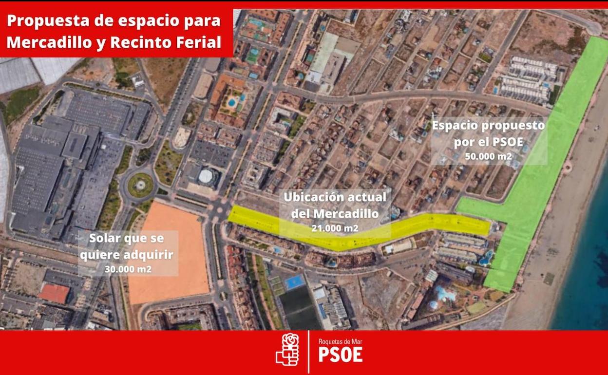 El PSOE de Roquetas de Mar ha anunciado la presentación de una moción para que el Ayuntamiento estudie la ubicación del Mercadillo semanal y el ... Recinto Ferial, en una franja de espacios libres municipales existentes en primera línea de playa de Las Salinas. Se trata, en palabras del portavoz socialista, Manolo García, de un espacio «mucho más idóneo» para estos usos que el que el Ayuntamiento se plantea ahora adquirir frente al centro comercial.