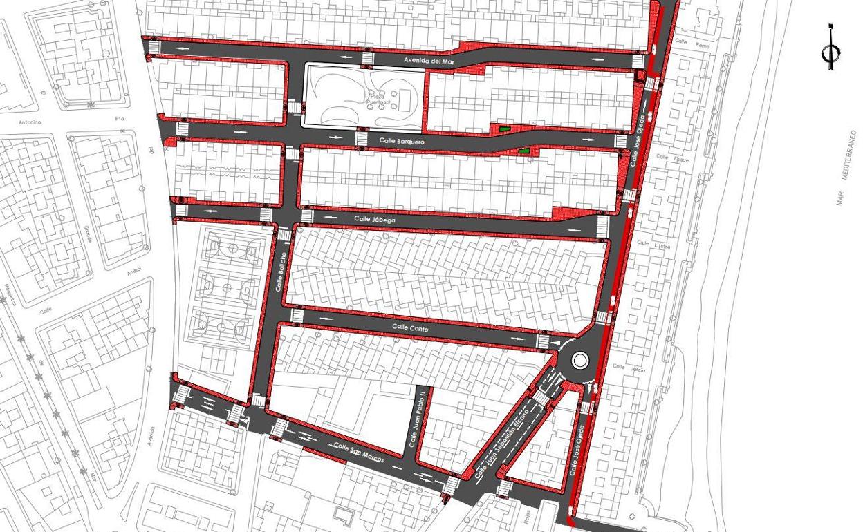 Los trabajos afectarán concretamente a las calles Barquero, Jábega, Canto, San Marcos, Juan Pablo II, Juan Sebastián Elcano, José Ojeda y avenida del Mar. En el pliego de licitación, se detalló la necesidad de mejorar o renovar por completo las redes y servicios de abastecimiento, saneamiento, telefonía, baja tensión, alumbrado público, pluviales, pavimentos, gas natural y señalización, dado el deterioro y en algunos casos la obsolescencia de los actuales. Además, también se trabajará en la eliminación de las barreras arquitectónicas existentes, instalando vados accesibles en las aceras, creando itinerarios completamente accesibles.
