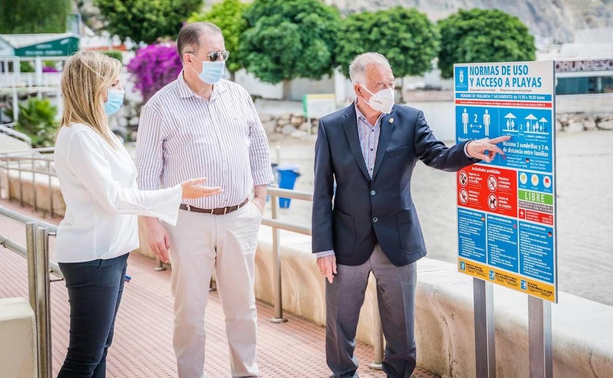 El alcalde de Roquetas de Mar, Gabriel Amat, y los concejales de Turismo y Playas, Francisco Barrionuevo, y de Presidencia, Agricultura y Pesca, Rocío Sánchez, ... han visitado la playa de Aguadulce, donde se ha comenzado la instalación de la cartelería específica con la normativa y las recomendaciones para el disfrute de las playas, que está permitido desde el lunes 25 de mayo.