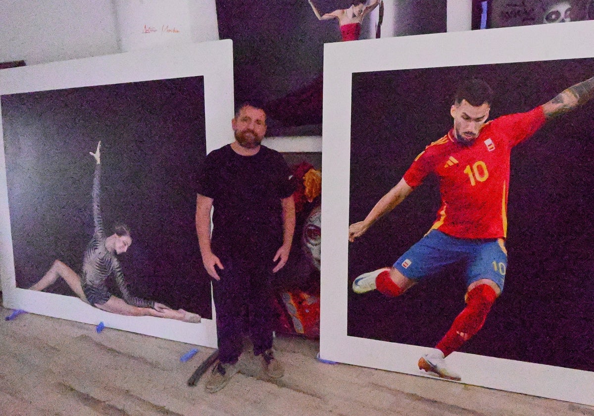 En toda la serie de pinturas sobre deportistas siempre se añade un elemento u objeto a la pintura que ensalza mucho más la obra. «Efectivamente, hay un objeto real camuflado entre la pintura que a cierta distancia te puede confundir. Y ese objeto es pro-pio de cada disciplina deportiva. En Rafa Nadal es una pelota de tenis, en Álex Baena es el balón de la final olímpica. Cada uno tiene un elemento real».