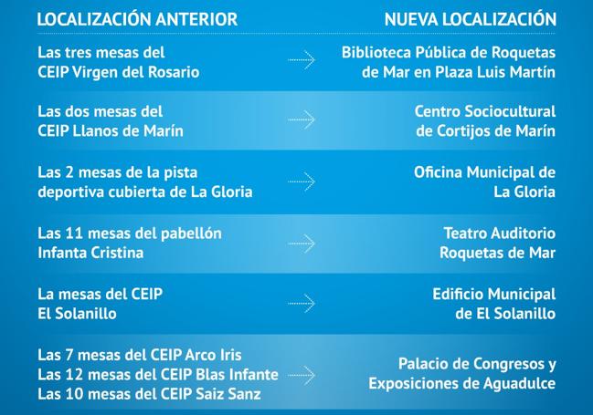 La Biblioteca Municipal de Roquetas de Mar, ubicada en la Plaza Luis Martín, acogería las tres mesas ubicadas en el C.E.I.P Virgen del Rosario. Las dos mesas que tradicionalmente se han ubicado en el C.E.I.P Llanos de María se trasladaría al Centro Sociocultural de Cortijos de Marín.