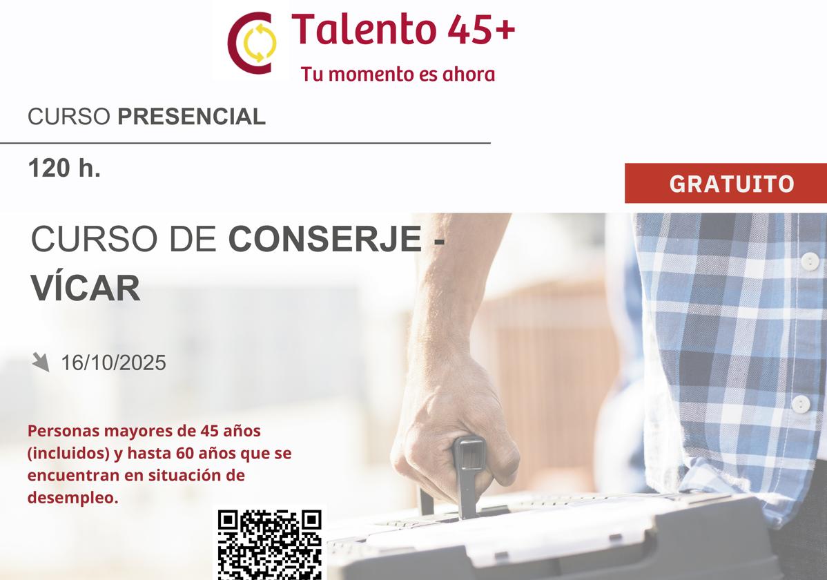 La Cámara de Comercio de Almería, a través de Talento 45+ del Fondo Social Europeo Plus, organiza un curso formativo para ser conserje que se ... va a desarrollar en el mes de octubre en Vícar, en el que colabora además el grupo Eracis+ de Vícar.
